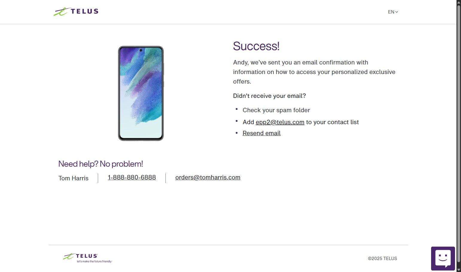 By the end of these steps, you’ve chosen your plan, reviewed all fees and add-ons, and completed your TELUS EPP Add-A-Line order with a clear summary of what you’re getting. Keep your confirmation and verification emails handy, and remember you can always visit or contact your local Tom Harris store if you need help with next steps, renewals, or adding lines later.