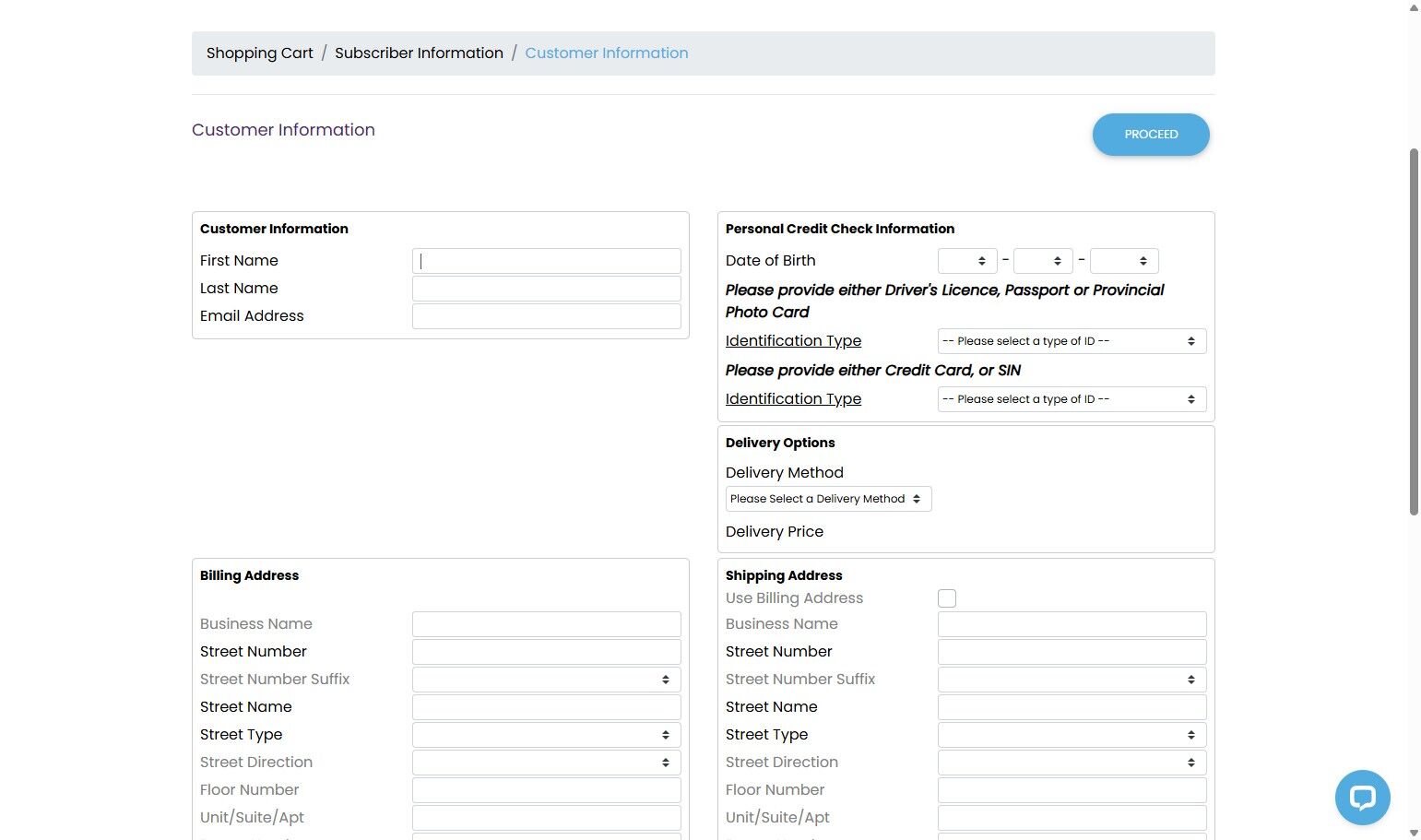 Step 18: Enter your contact details, then provide the requested ID information so TELUS can complete the required personal credit check to approve your plan and any device financing, then fill in your billing/shipping address, choose a delivery method, type in any additional comments (if any), and click Proceed to continue.